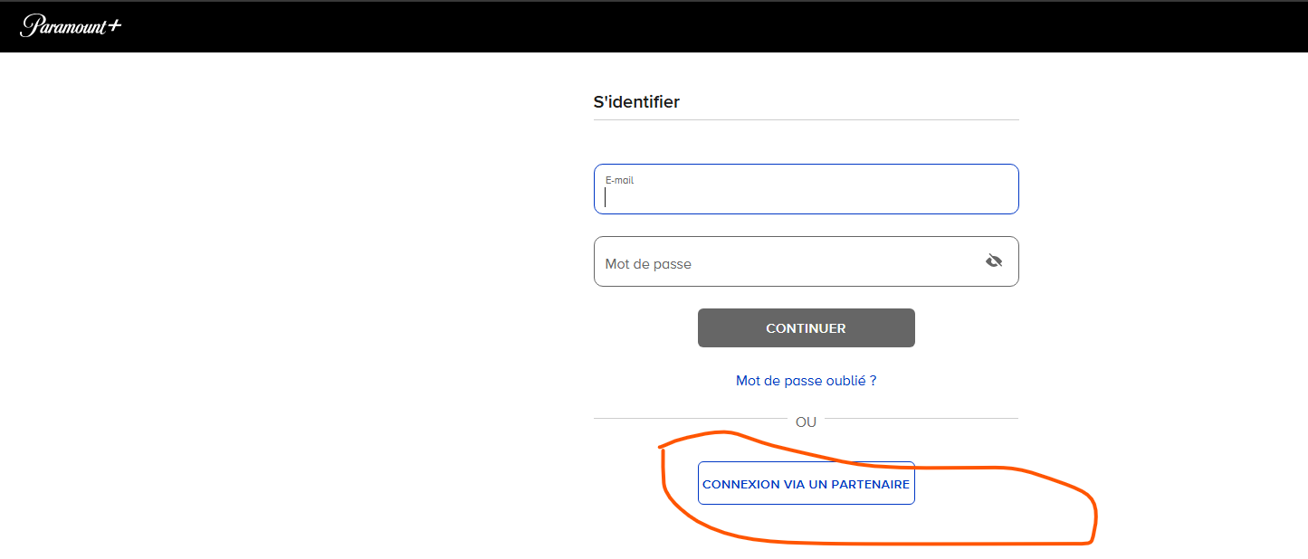 Lors de votre première visite, il faut passer par « Se connecter avec un partenaire ». Une fois le lien établi, Paramount+ vous demandera de créer votre compte. À ce moment-là, vous pouvez soit :
