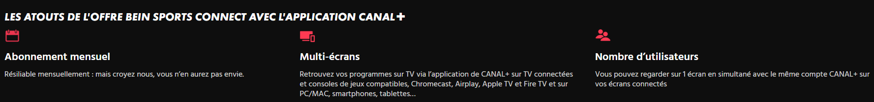 Sur la boutique canalplus (https://boutique.canalplus.com/produits/beincnct/bein-sports-connect/1/1?hasAllCommitments=false&isMinimalPrice=false), l'offre bein sports connect est décrite de cette manière : "LES ATOUTS DE L’OFFRE BEIN SPORTS CONNECT AVEC L’APPLICATION CANAL+" "Nombre d’utilisateurs