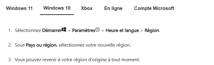 Pensez également à vérifier si votre Store est bien paramétré pour la France Métropolitaine. Sur le site de Microsoft, ceci est indiqué pour le modifier sous Windows 10.