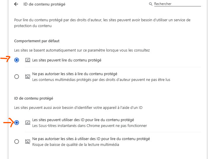 En renseignant "chrome://settings/content/protectedContent" dans la barre d'url, est-ce que les 2 choix ci-dessous sont bien cochés.