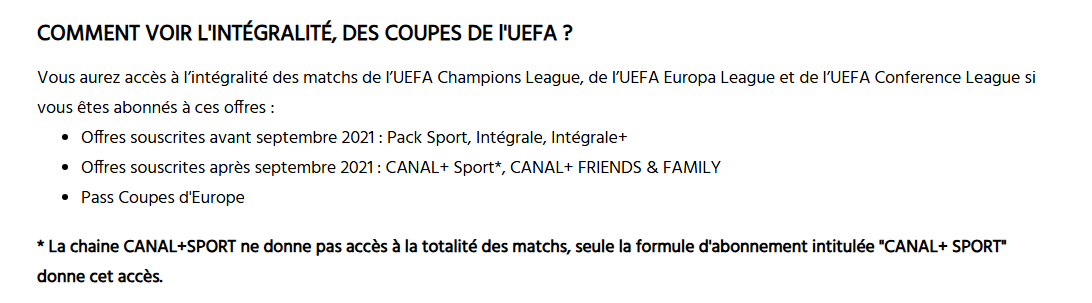 Afin de vous permettre d’accéder à 100 % des matchs, nous vous invitons à souscrire à l’option Pass Coupes d’Europe, qui permet de bénéficier de l’ensemble des diffusions.