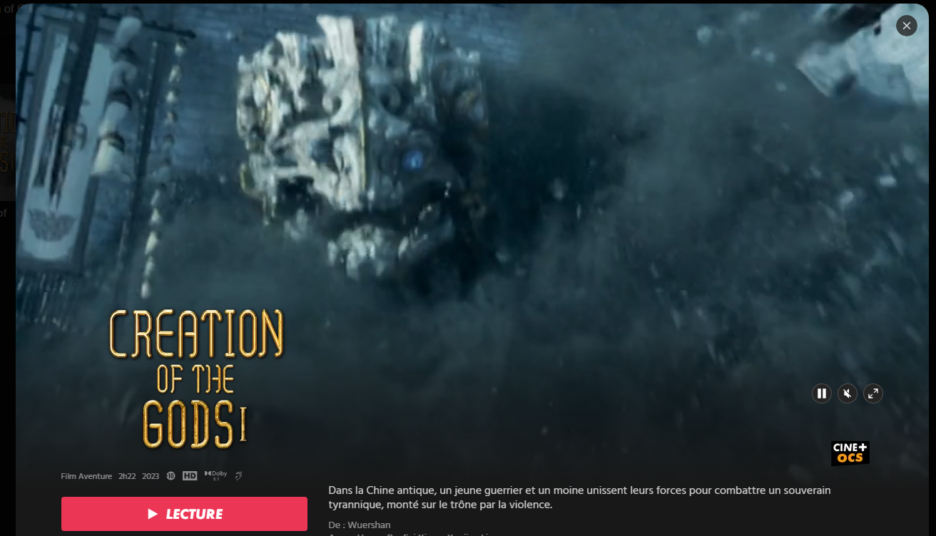 Le film Creation of Gods II est censé être disponible sur OCS (encore 10 jours), il n'apparait pas quand je le recherche sur MyCanal, or je suis bien abonné à OCS.