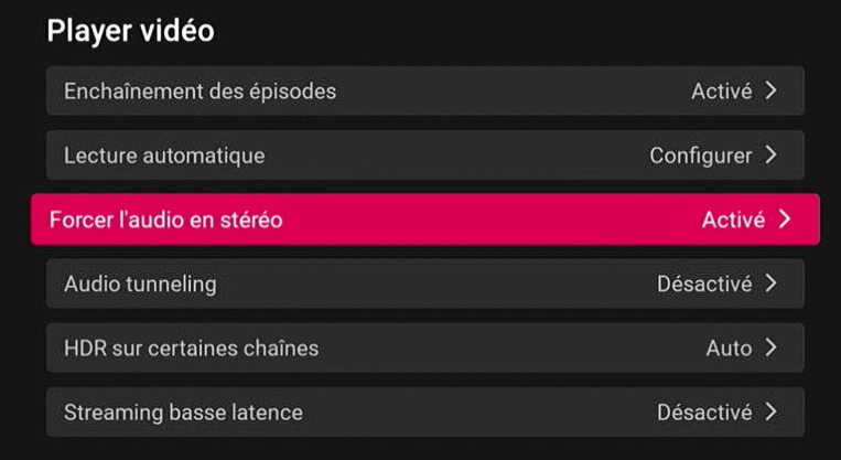 Pouvez-vous, dans les réglages de l'application CANAL+, forcer l'audio en stéréo et m'indiquer si les contenus concernés se lancent ?